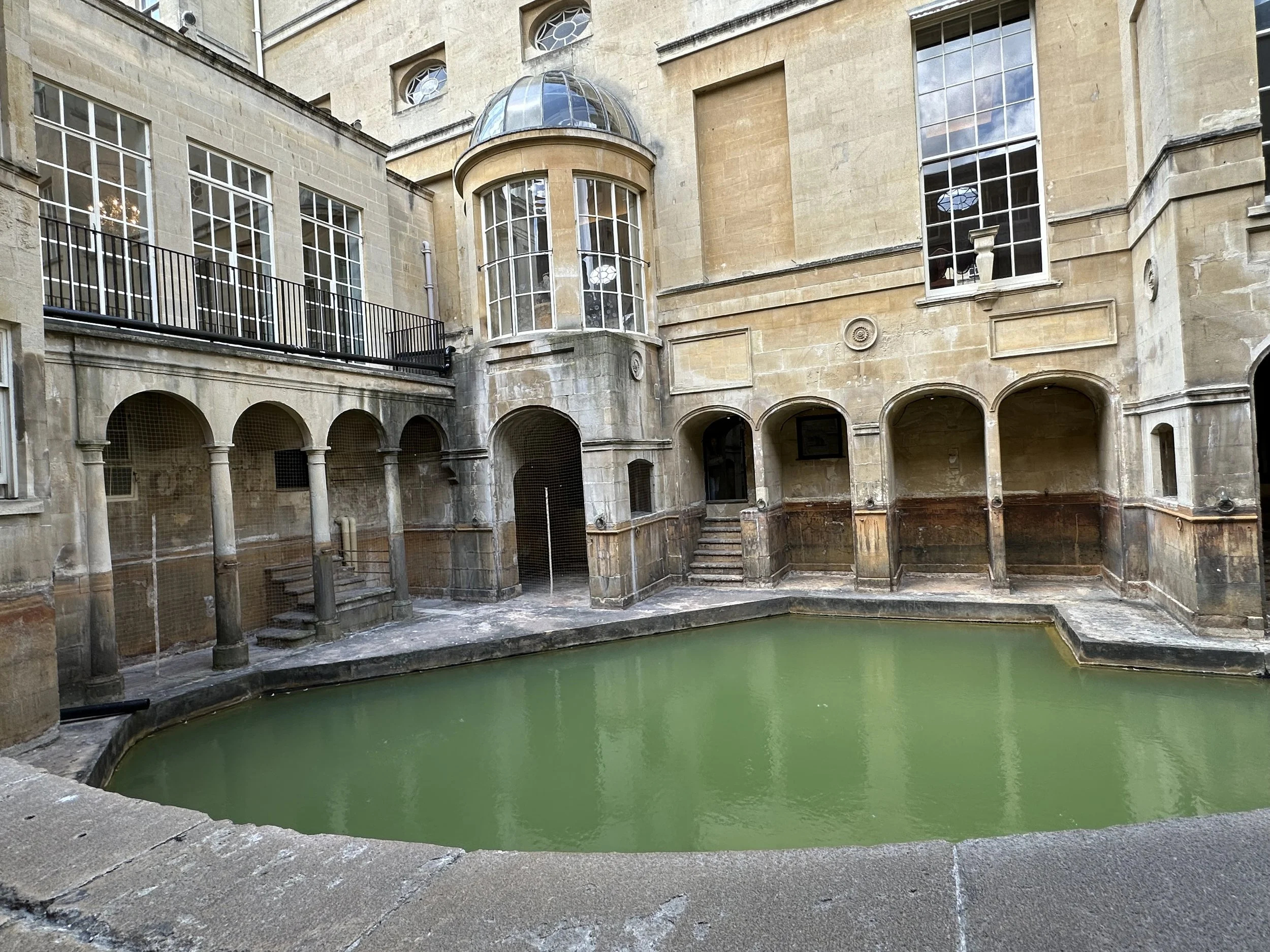 The fun continues… walking into the queue for the Roman Baths, I noticed this beautiful dome above me. We figured we wanted to get the full taste of Bath’s interesting history. With a heavy Roman influence, touring the baths showed us just how much. We picked up the hand held device in English, so we could learn the significance of each room and what we were seeing.
