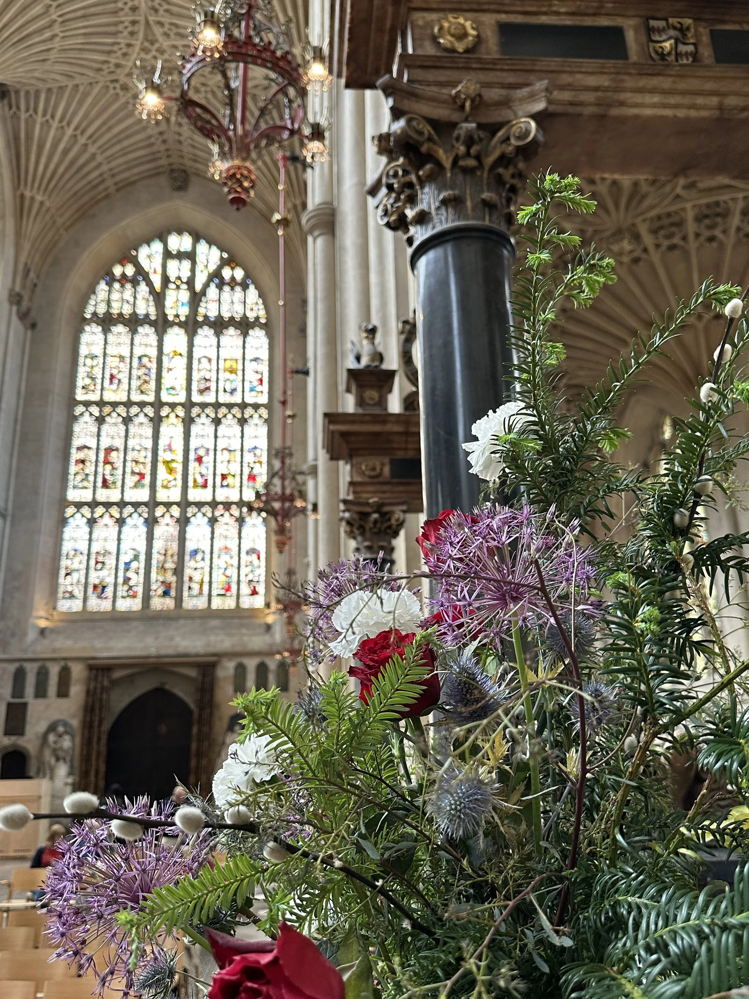 Last impression of the Bath Abbey… flowers, stained glass and hanging lamps.