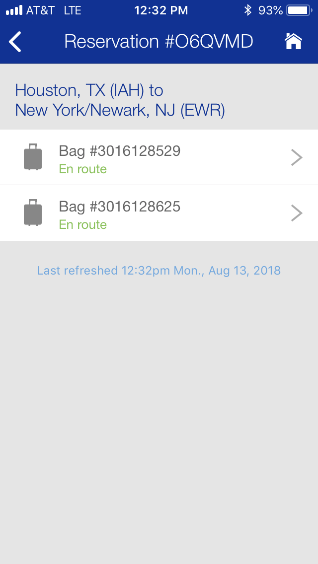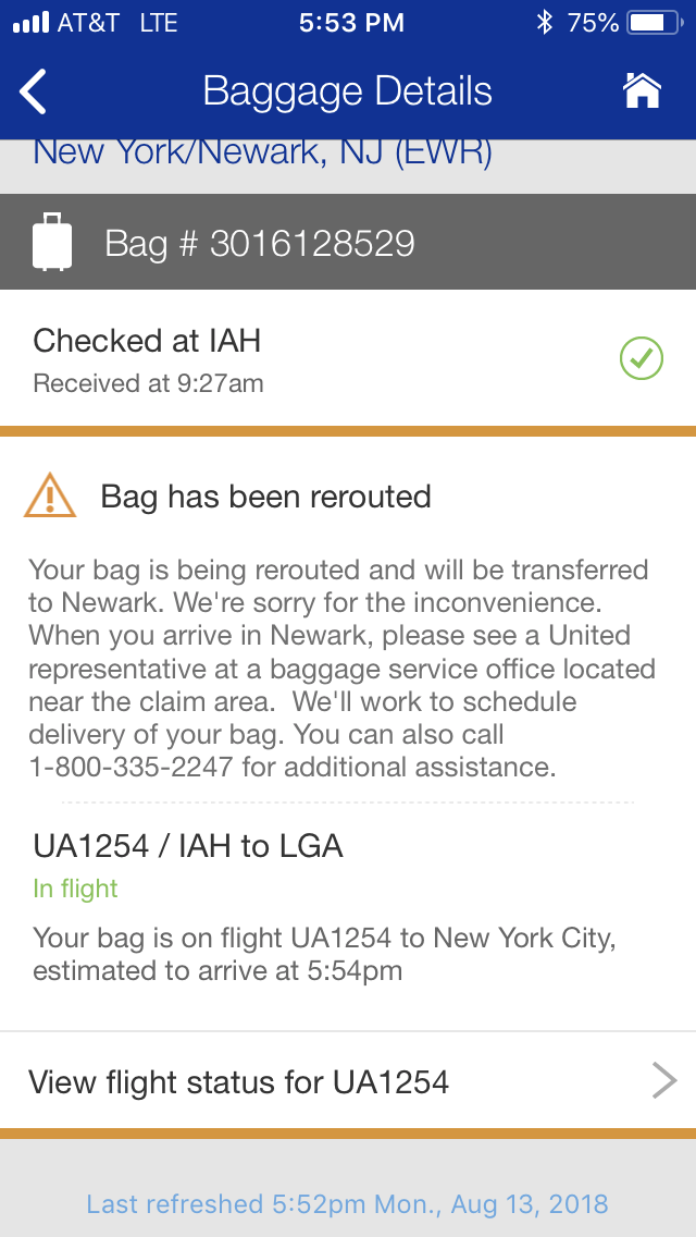 Delta has this new thing… free WiFi in flight so “you can keep in touch with your loved ones”. This allowed me to communicate with Barry. Realizing that he might need a little help tracking the baggage, I used the United App to determine the arrival time and baggage claim carousel number. Oh my… scrolling down to “track my luggage”, I had a huge surprise waiting! Because United had me listed for Newark, I was notified my luggage was heading to Newark!!! CURSES! I was on my way to LaGuardia, Barry is already at LaGuardia... now what???