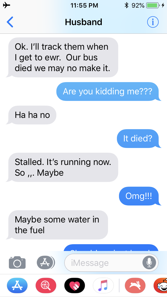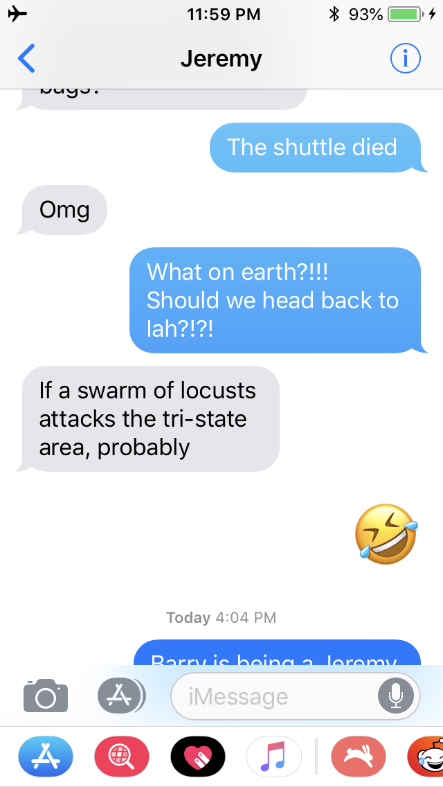 Now, I’m in the air, Barry is on a shuttle and the luggage is in transit… then I receive a txt from my dear husband informing me he may not make it because the shuttle died! Seriously? How can this be?