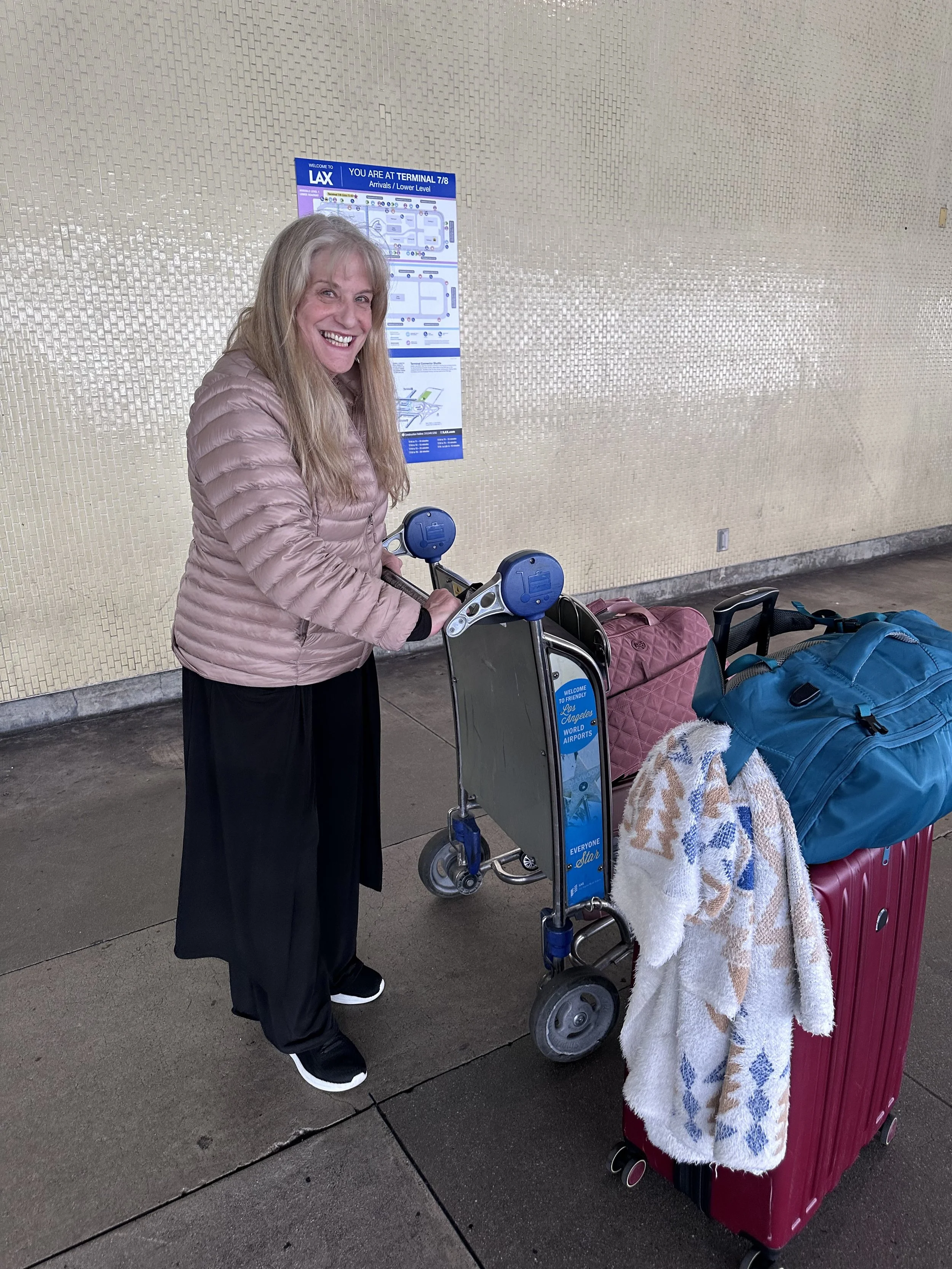 Without a glitch, Roxanne and I boarded the first leg of our flight to LAX. Our upgraded seats allowed us more legroom. As an “employee”, I was able to check both of our bags (full of cruise clothes) and Roxanne was able to bring a “carry on” bag along with our personal items. It’s such a crazy game getting all of our things on at no extra charge!