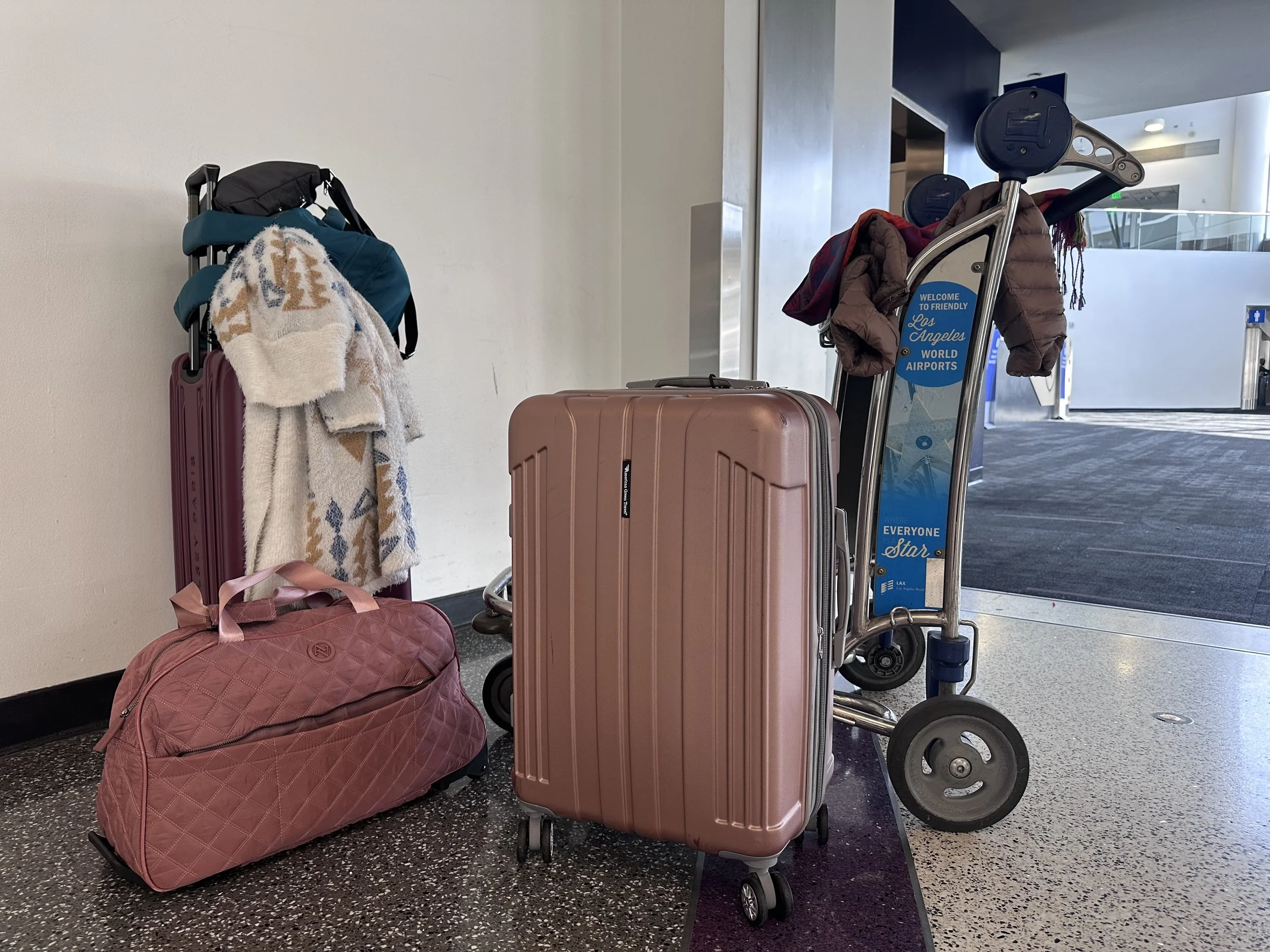 With HOURS before our next flight, Roxanne decided a luggage cart might be our best bet. We have had a bit of a challenge in the luggage department… buying bags only to have the frames crack, wheels break off, etc. I went out (with a valid suggestion from Jeremy) and bought a Costco set of luggage. So far… VERY good! Easy to spot, wheels seem solid (big deal while traveling). This might be the luggage I’ve been searching for!