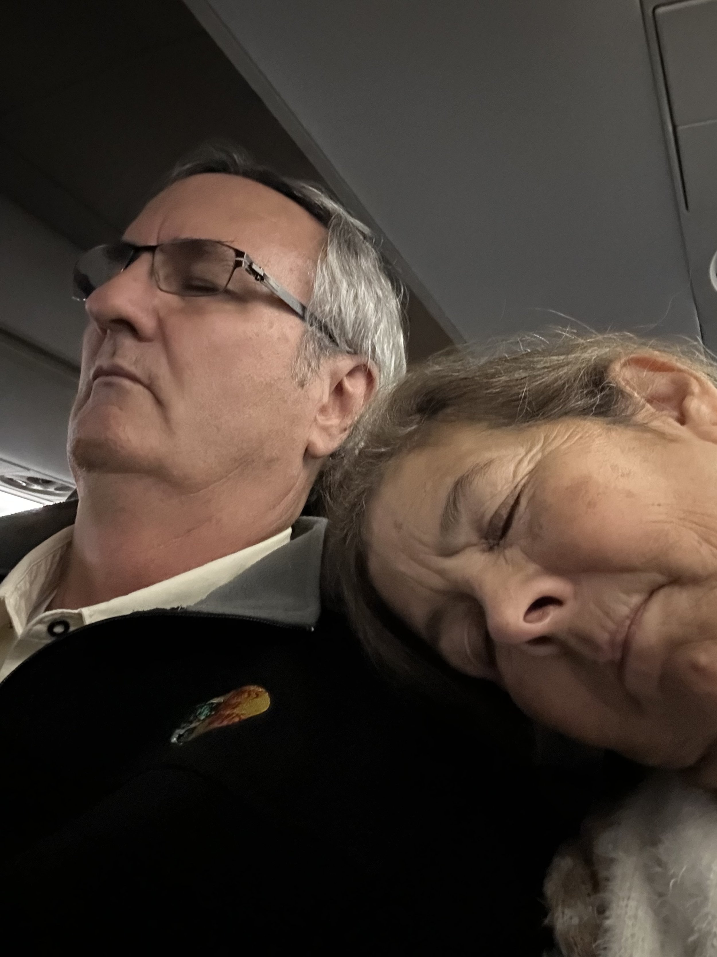 Within minutes of takeoff, Barry was sound asleep. As for me? I was enjoying a fun phenomenon! Off to the right of the airplane, a beautiful sunset. Shades of pinks and oranges lit the sky. On the left side of the plane, a full moon was rising… dusk on one side, nighttime on the other. Not the greatest moon photo but I only had my iphone and anything through an airplane window is difficult.