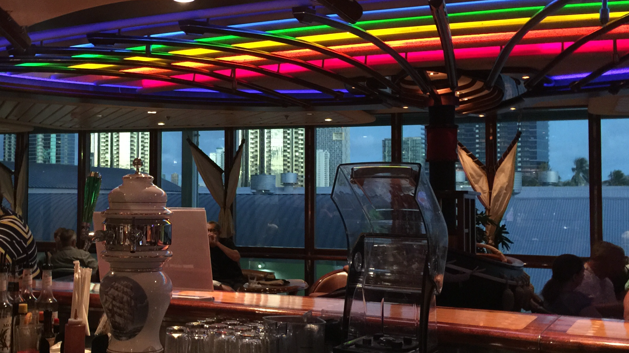 With breakfast a success, we walked back to grab our luggage and once again got an Uber. Very entertaining young lady who shared with us that she only picked us up because she was on her way to the beach and we were going in the right direction. Work wasn’t really her “thing”, she preferred to hang out with friends and read. Her very special parting words? “I think it’s so cool that you still travel at your age” Ouch… Boarding was quick and we were able to drop off our luggage in record time. Now it was time for our first cocktail in Schooner Bar over looking Honolulu.