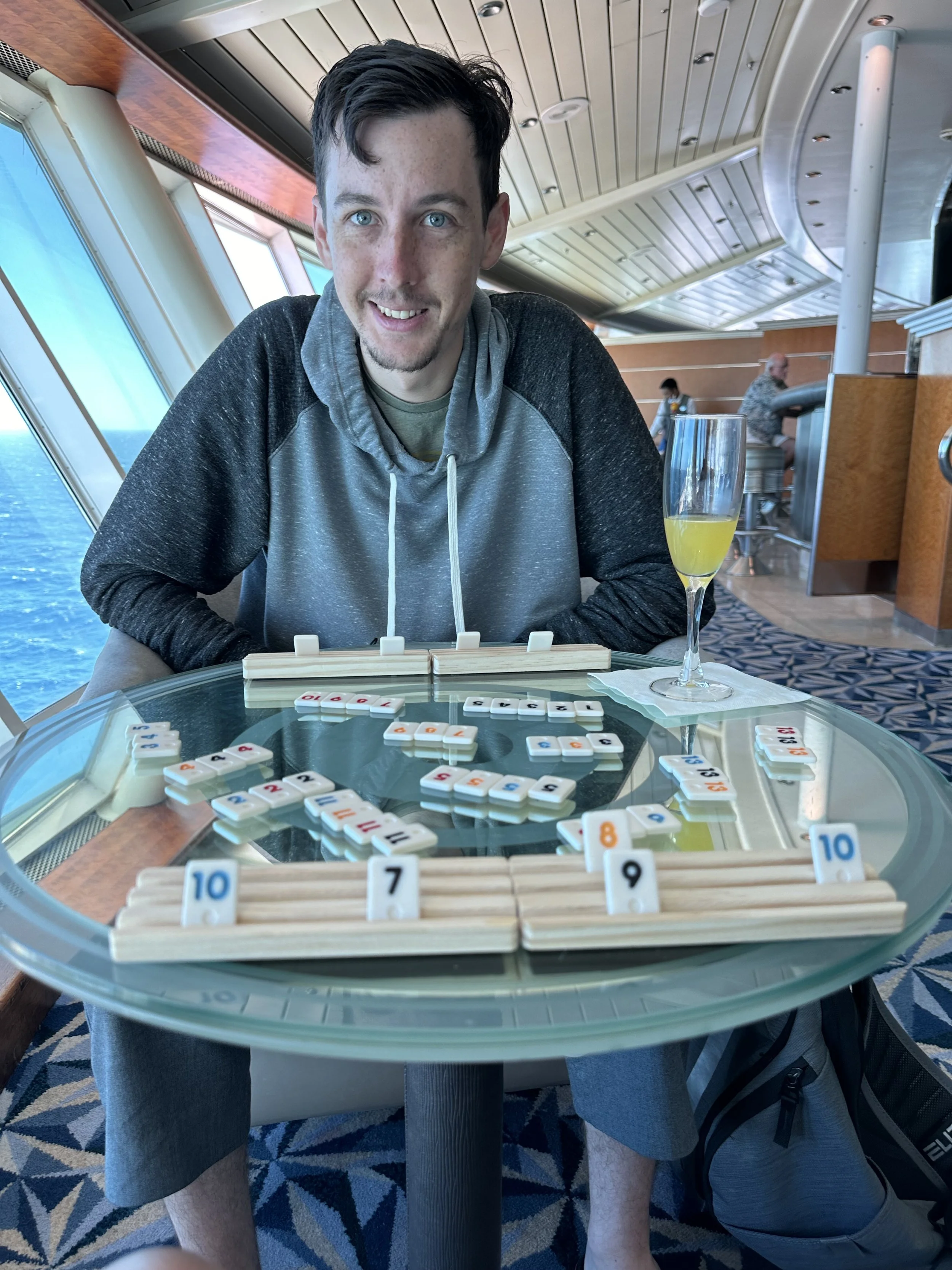 Our activity of choice, instead of heading to port… games, games and more games. This particular afternoon, we opted for Rumikub. The lightweight addition to my travel game collection, kept us entertained for hours! Weighing a mere one and a half pounds, this game comes with tiles and the balsa wood racks. It will go everywhere with my now! Lucky for me that my son enjoys games because we spent countless hours playing each sea day.