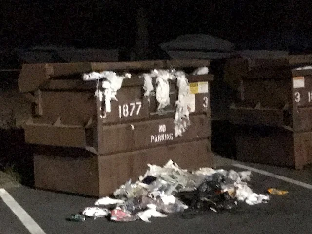 With summer season, comes bears. They wake up after a long winter's sleep. They go for the mountain apples, but when they've all been eaten... trash. These dumpsters are locked down but the bears squeeze their paws in the timy gap and pull out trash to eat. They NEVER clean up after themselves!