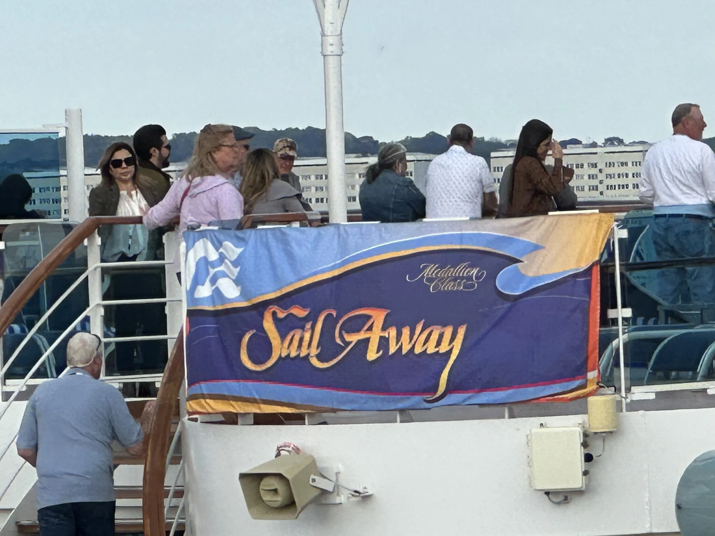 In our cabin, we noticed the ship was beginning to move. Over an hour past our scheduled departure, I headed up one flight to attend the “Sail Away” party. Apparently, the party was held at the time we were supposed to sail away… and by the time I arrived, the band was packing up. So, I missed it completely!