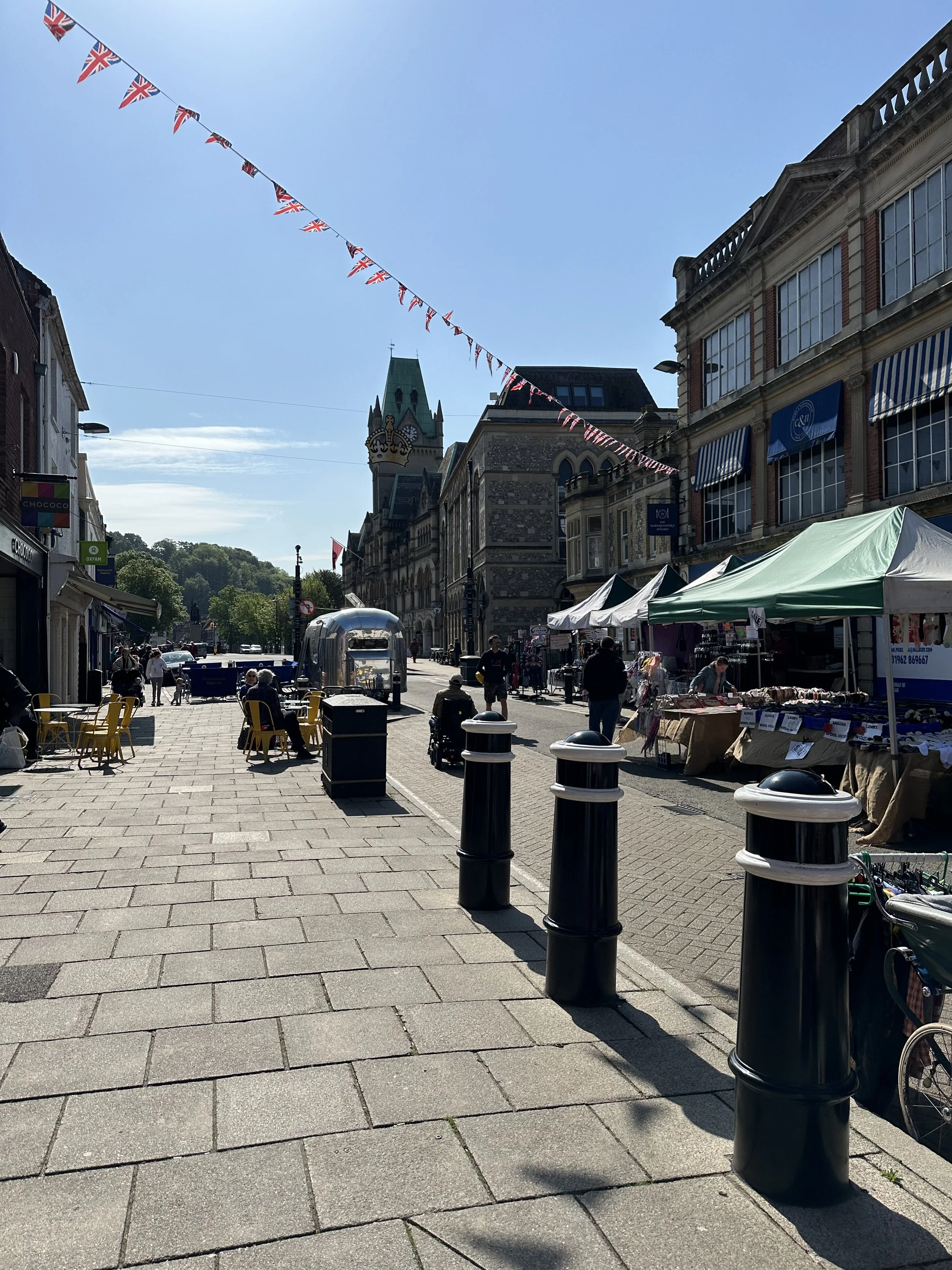 Here’s a quick site of lively Winchester… our last look before leaving town. Flowers, plants, artwork and clothing for sale in each of the little booths. Street musicians keep people entertained. It’s a very fun atmosphere!