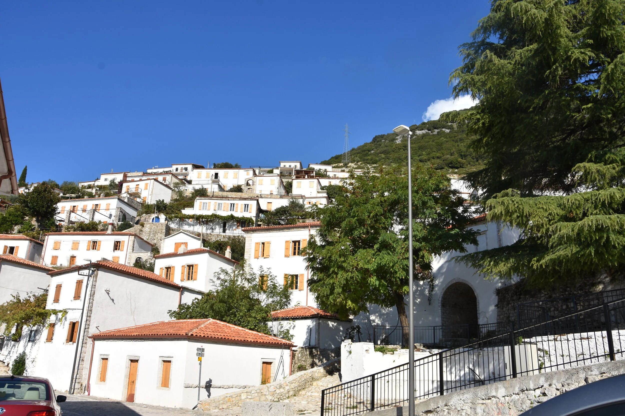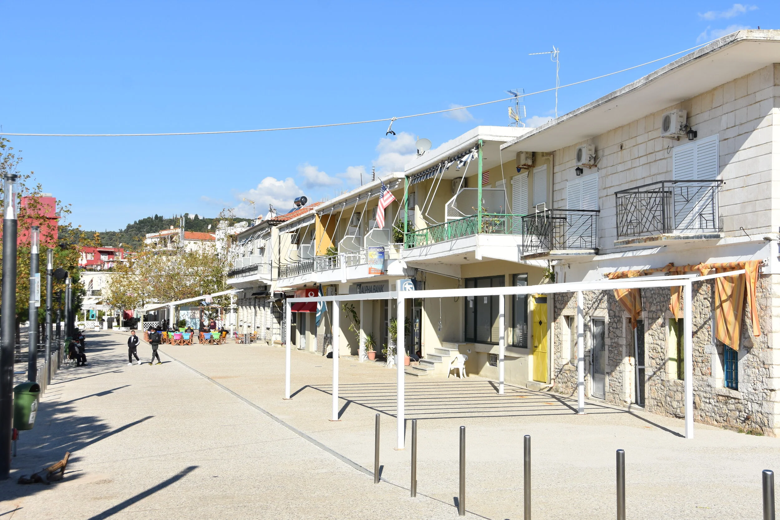 After a good night sleep, we awoke to cappuccino, homemade jelly (grape and fig), whipped butter, fresh goat cheese and bread (which I couldn’t enjoy). We walked across the street to check out the Ionian Sea. In this photo is the restaurant-lined walk. Above the businesses are flats… as you can see, one is owned by an American. During the summer months, this is a heavily occupied tourist area. Though the weather is fantastic, summer is over and the crowds have disappeared.