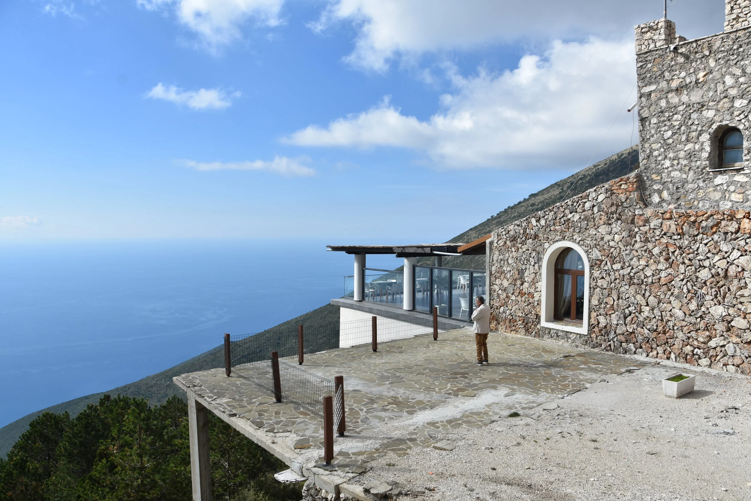 Look at the fun in store for us! The lines zig-zagging across the mountain… the road we take to cross the Ceraunian Mountains. It winds through villages and well… quite frankly, the drop off was frightening! But it was beautiful!