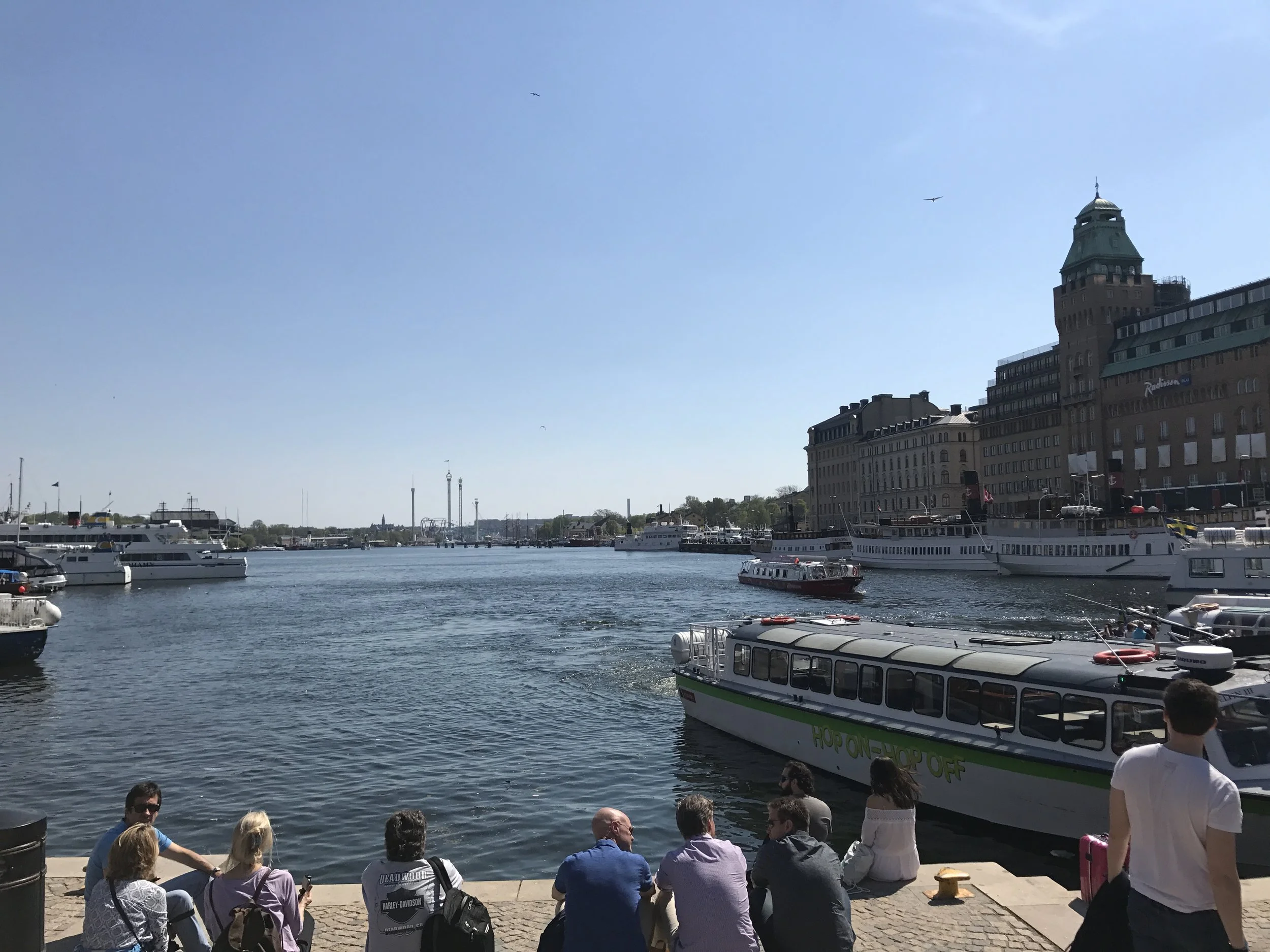 We arrived early so we sat in a little park across from the harbor to wait for our friends. People lined the steps waiting for the different ferries. Some were dinner boats and some took visitors out to one of the islands of the archipelago.