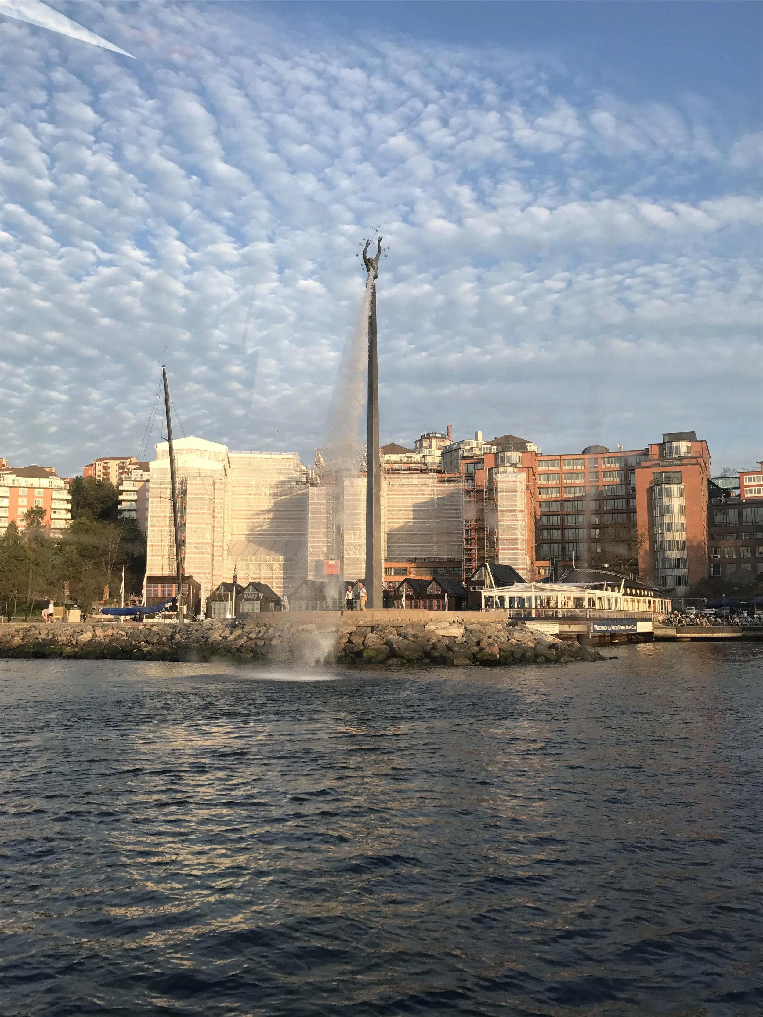 Named "God our Father on the Rainbow", this sculpture/fountain really caught my attention! There are angels handing God stars to be placed in heaven. Such a meaningful work of art.The sun hit it at just the right angle. It's on the pier at Nacka Strand, where you can find shops and restaurants. This just adds to the splendor of Sweden's coastline.