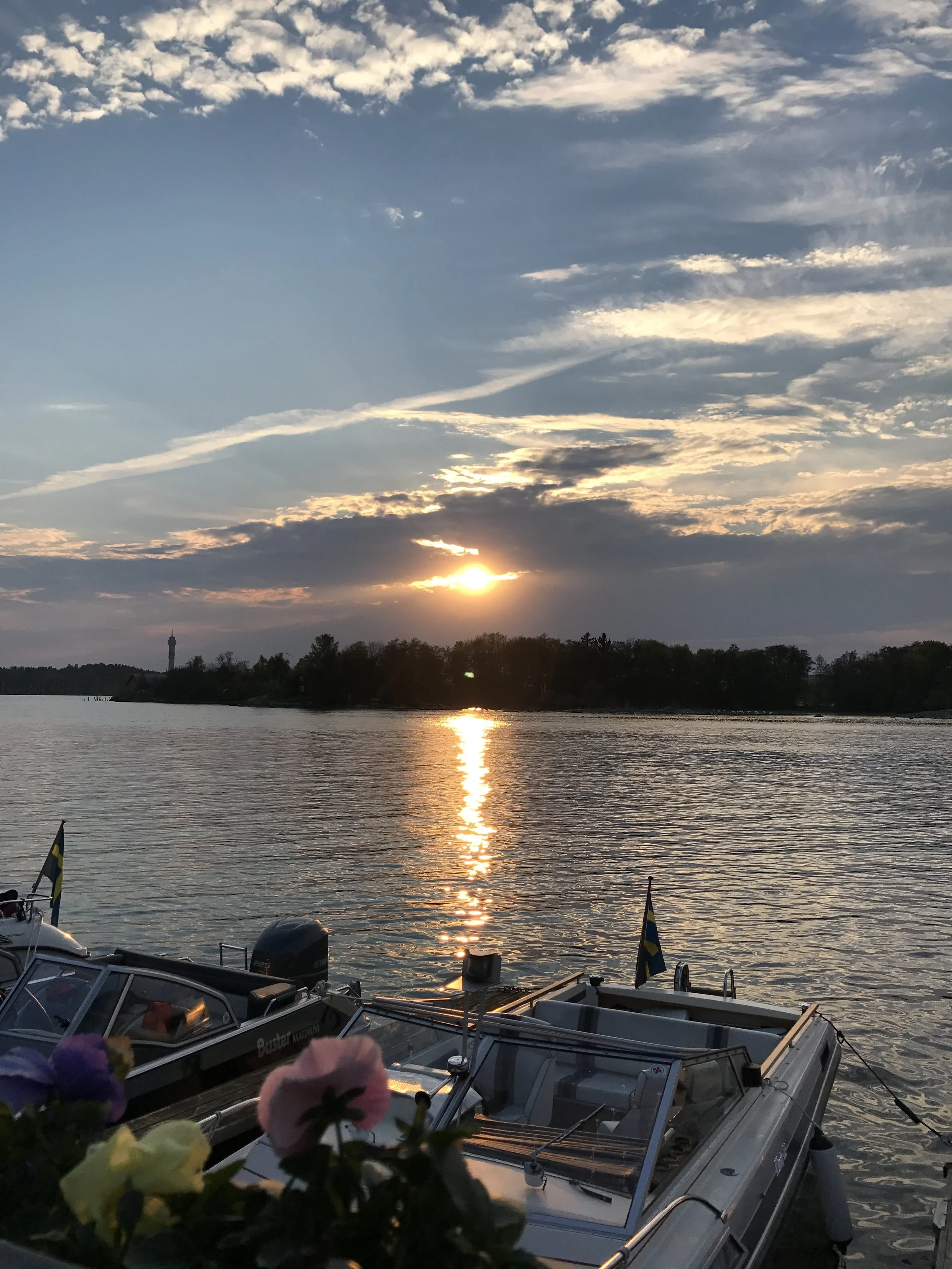 The sun was in full setting mode by this time... a ferry came in full of girls celebrating a Bachelorette party. They were drinking shots on the ferry... and had called ahead to order 50 shots! They were bar hopping... like a pub crawl... in the archipelago! The music was loud, the laughter was louder. Nothing more beautiful than glimmering water.