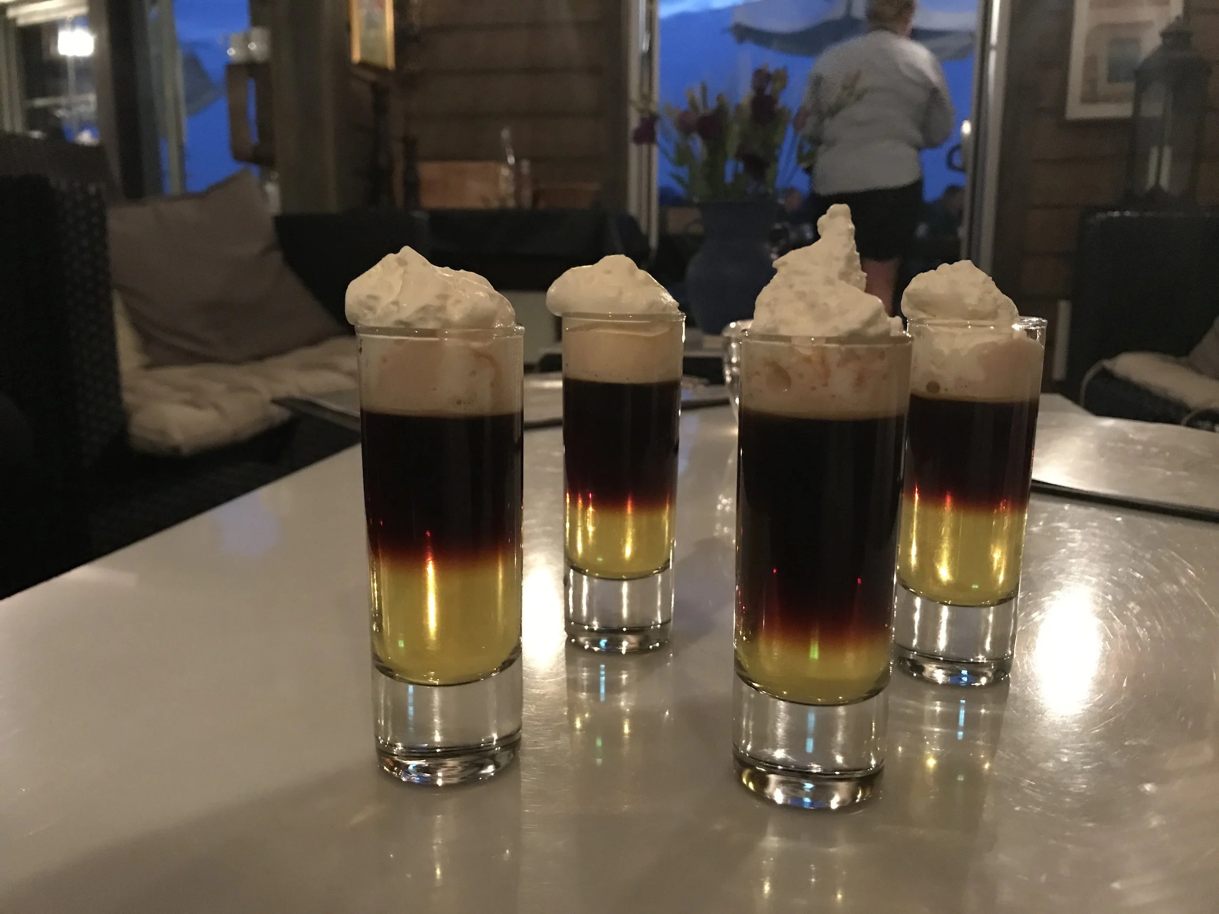 Our friends said they had a special treat for "dessert". Then these were delivered. They are called "Hot Shots". Simple to make, the shots have Galliano, Espresso and heavy cream. This restaurant also added a dollop of whipped cream. Yummy!!!